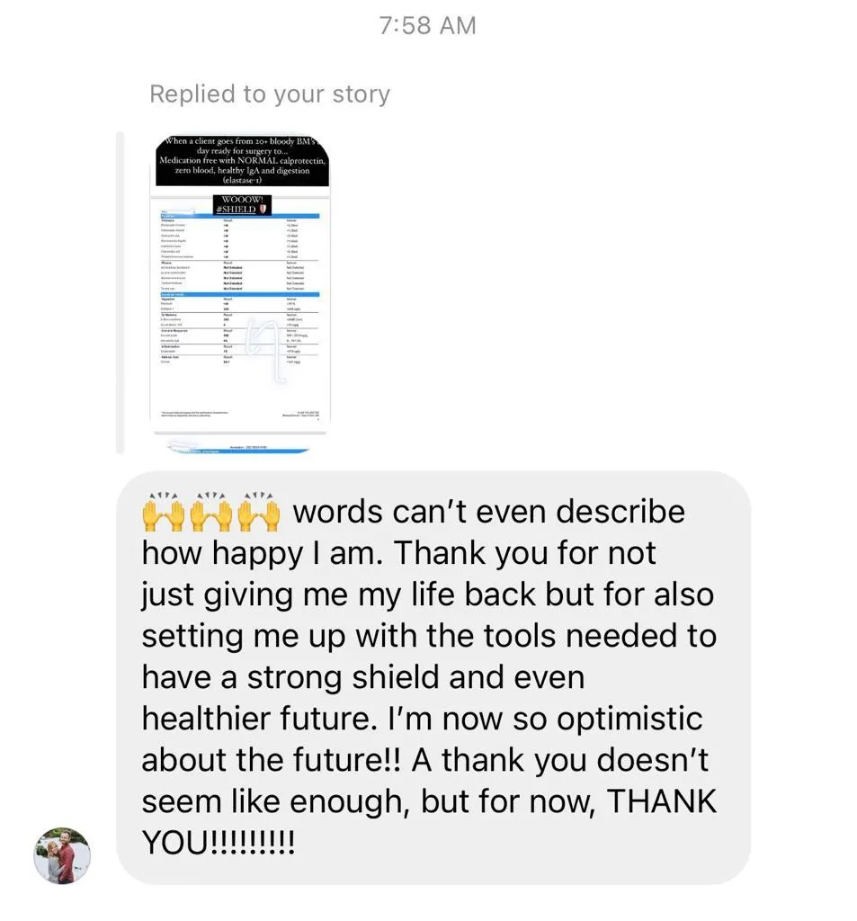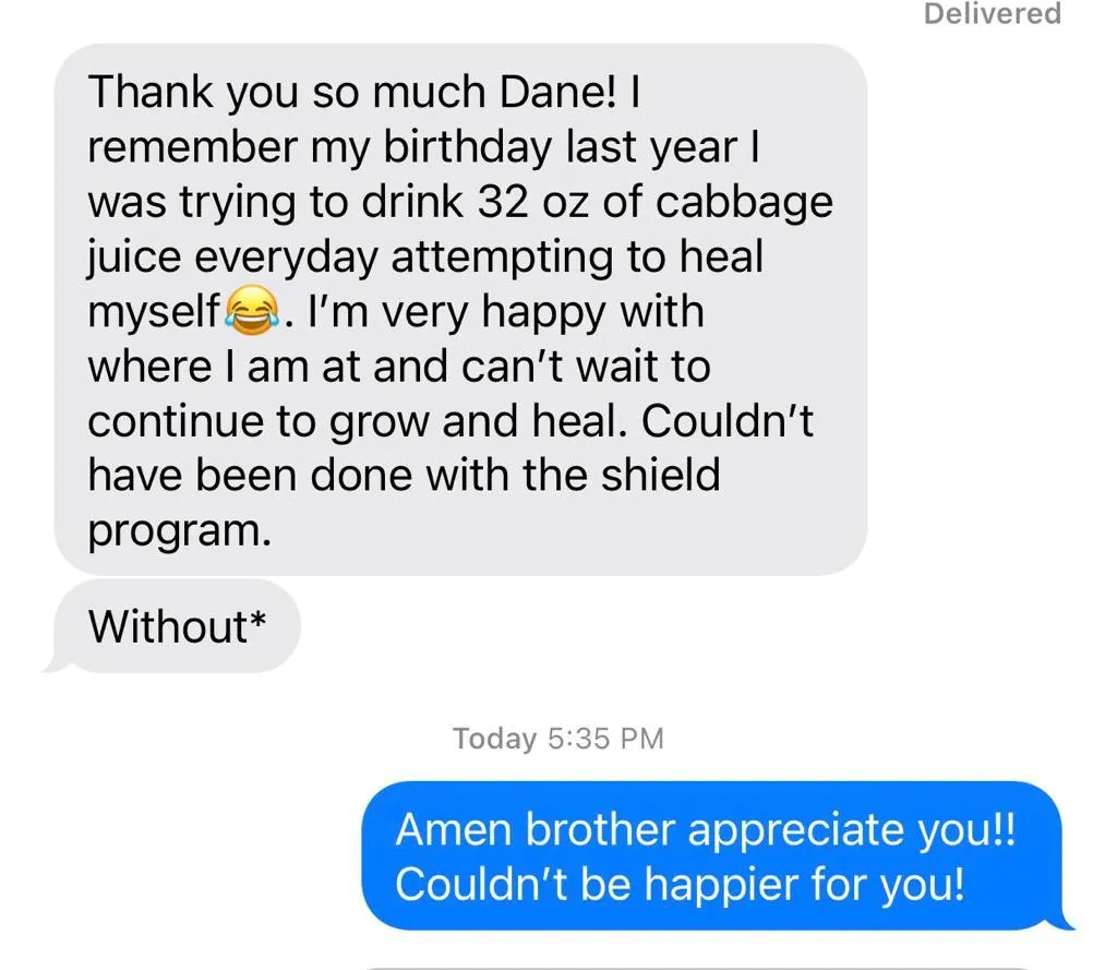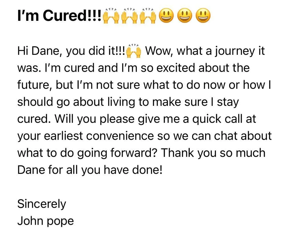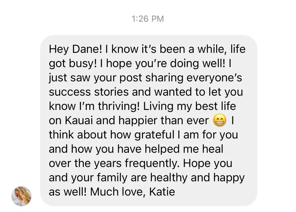 Today, Dane has been symptom, medication and surgery free for 7 years. He has helped 100’s of other do the same through a fully customized functional medicine system called S.H.E.L.D working synergistically with doctors around the world. He is considered one of the most effective and passionate Crohns/Colitis Specialist in modern medicine. (Watch Dane's Story)